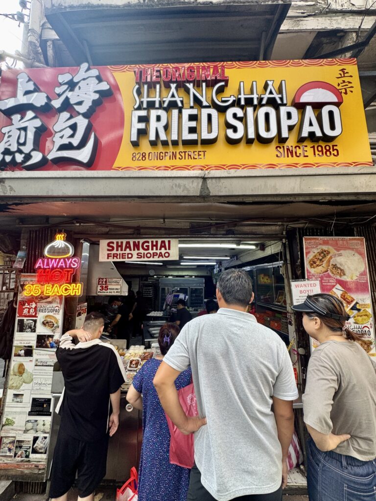 Shanghai Fried Siopao is on the corner, an iconic small shop with a long line.