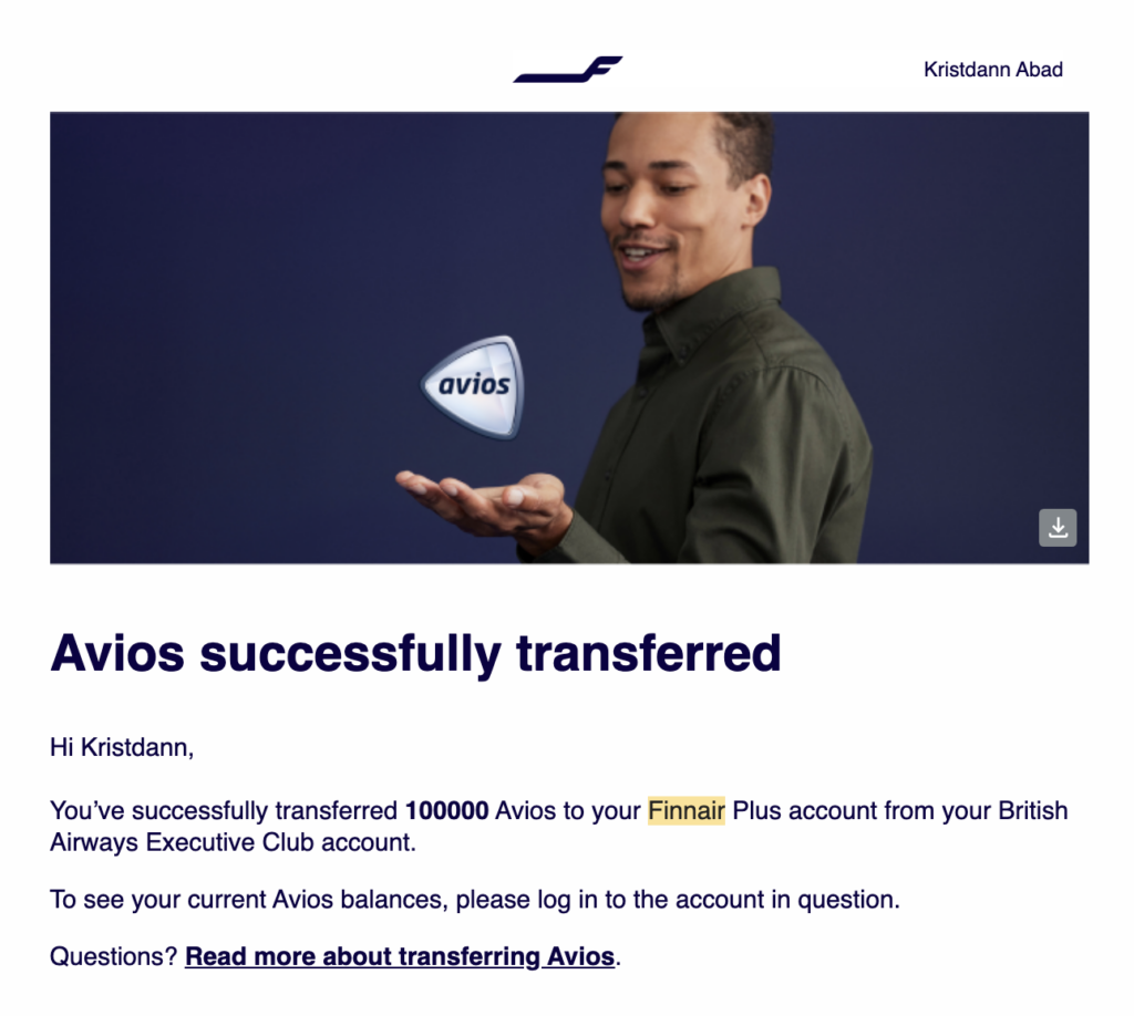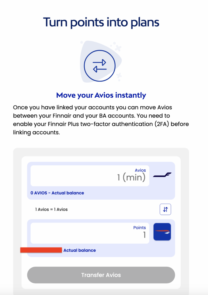 Once finished, you should see both balances displayed on your Finnair dashboard and the option to transfer Avios between programs.