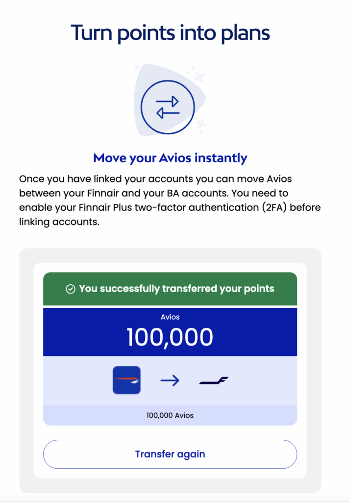 After successfully linking my accounts, I tested the transfer process by moving 100,000 British Airways Avios to Finnair Plus.